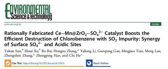 化学工程与技术系教师孙钰琨、徐帅、白波教授与西安交通大学何炽教授联合在环境领域权威期刊《Environmental Science & Technology》(《环境科学与技术》,影响因子:10.80)上发表题为“Rationally Fabricated Ce-Mn@ZrO2-SO42- Catalyst Boosts the Efficient Destruction of Chlorobenzene with SO2 Impurity: Synergy of Surface SO42- and Acidic Sites”的研究论文(文章链接://pubs.acs.org/doi/10.1021/acs.est.4c13915?ref=PDF)。该文采用Ce-O-Mn活性位点体系,辅以ZrO2-SO42-保护层,构筑了一种新型Ce-Mn@ZrO2-SO42--微米管催化剂,其不仅对氯苯深度净化表现出优异的活性,而且对SO2和水蒸气表现出优异的抗性。同时,深入剖析活性氧与多种酸位点的协同作用,是催化降解工业含氯可挥发性有机化合物的又一重大进展。